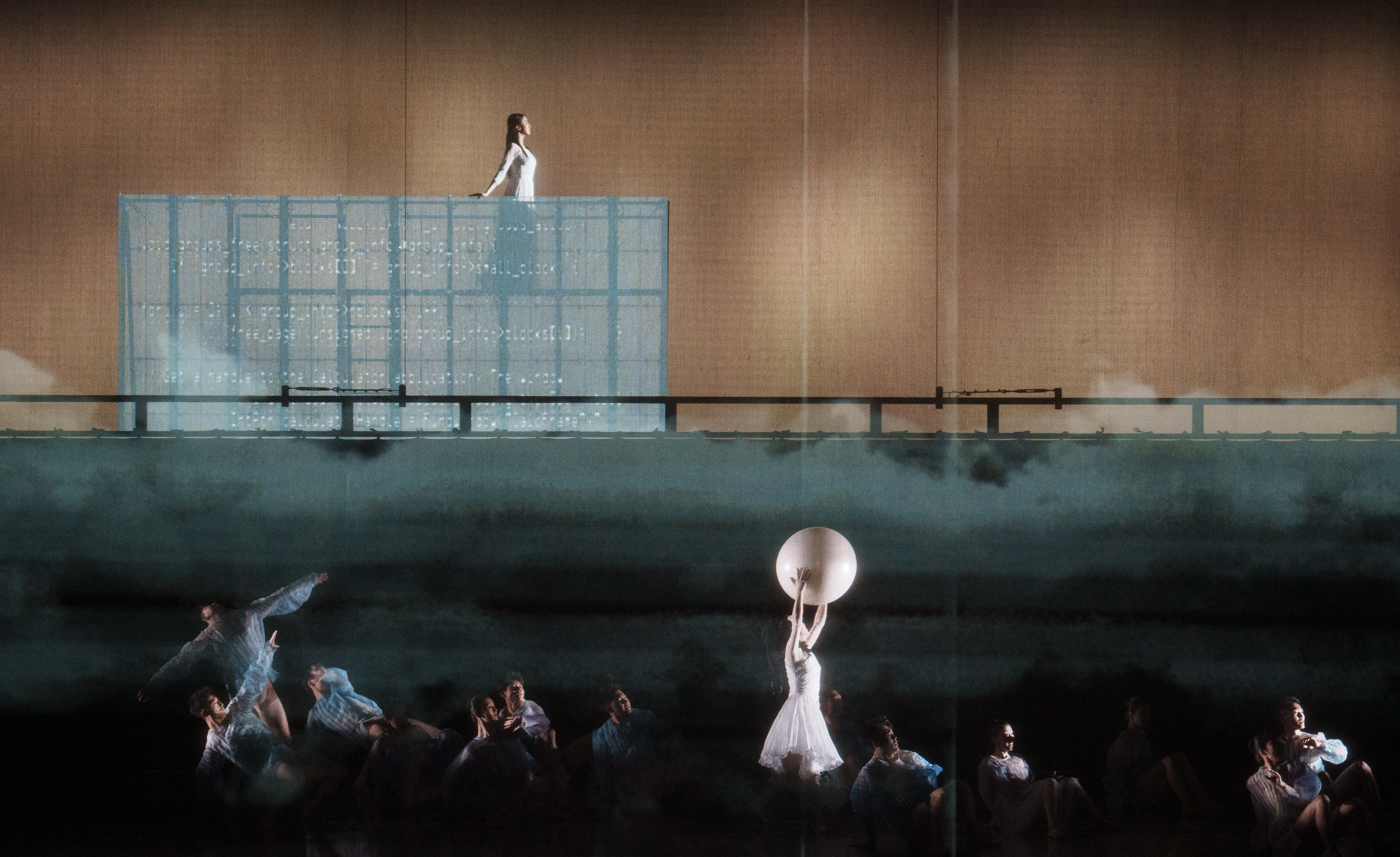 第一篇章《诗意地栖居》,运用舞蹈与各类视觉艺术交融的方式,编织出一个浪漫梦幻的诗意栖居之所,青山日出、绿水环绕、莹莹蓝天、汩汩草浪,是广阔天地之下是对美好生活的希冀,以一种诗意的生活方式让人获得内心的满足和恬静。