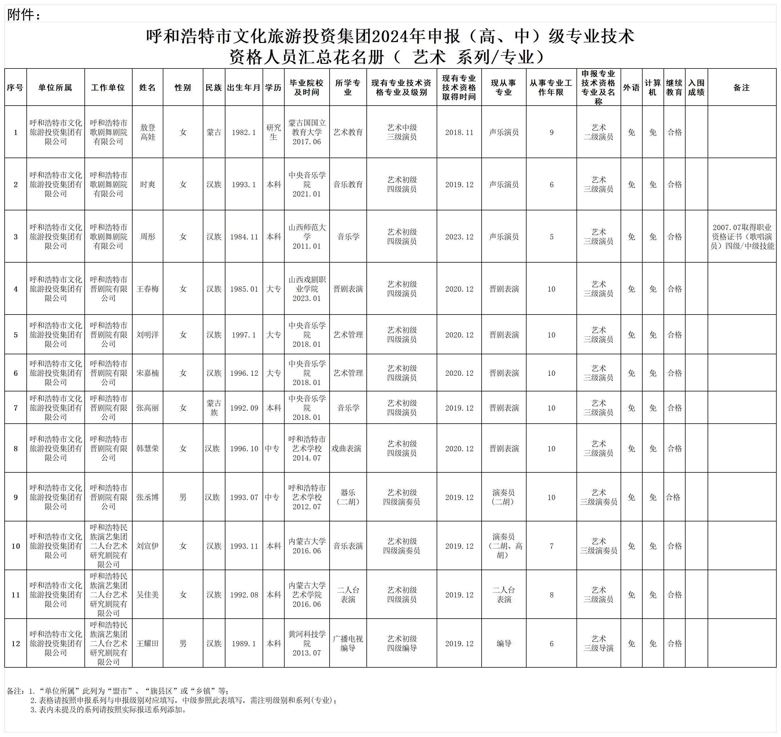 根据《内蒙古自治区人力资源和社会保障厅关于做好2024年全区职称评审工作的通知》(内人社办发〔2024〕85号)和《呼和浩特市人力资源和社会保障局关于做好2024年全市职称评审工作的通知》(呼人社办发〔2024〕85号)要求,经集团所属子公司推荐申报,集团组织人事部(人力资源部)专人对拟申报高中级专业技术资格人员申报推荐程序、申报资格、申报专业、申报材料进行审核等环节。现对集团所属子公司拟推荐2024年申报艺术、文学创作系列(高、中)级职称人员花名册进行公示,详见附件。