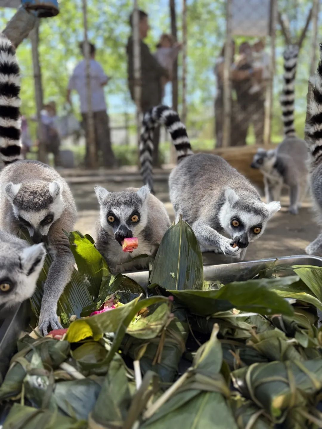 值得一提的是,此次活动特别设置“给动物包粽子”互动环节,园区饲养员依据不同动物的食性特点,精选新鲜营养食材,在黑熊池区域搭建专属体验区。游客不仅能亲手为小动物们包专属粽子,还能通过食材搭配探秘动物食性偏好。在投喂小动物们的同时也能观察到小动物觅食的行为特点。